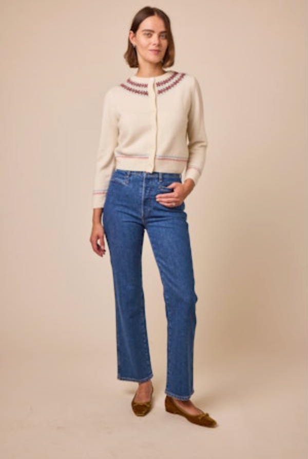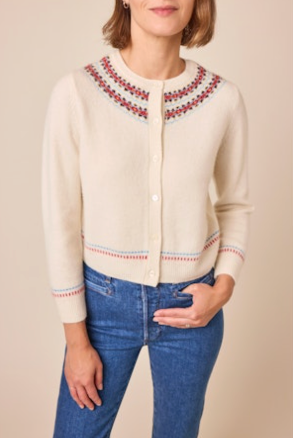 Knitted with our vintage-inspired Annecy Fair Isle pattern, the Olympe Cardigan is crafted from a warm wool blend softened with a touch of cashmere. It features a classic crew neckline, a fitted silhouette, and bracelet-length sleeves, finished with a line of mother-of-pearl buttons down the front.