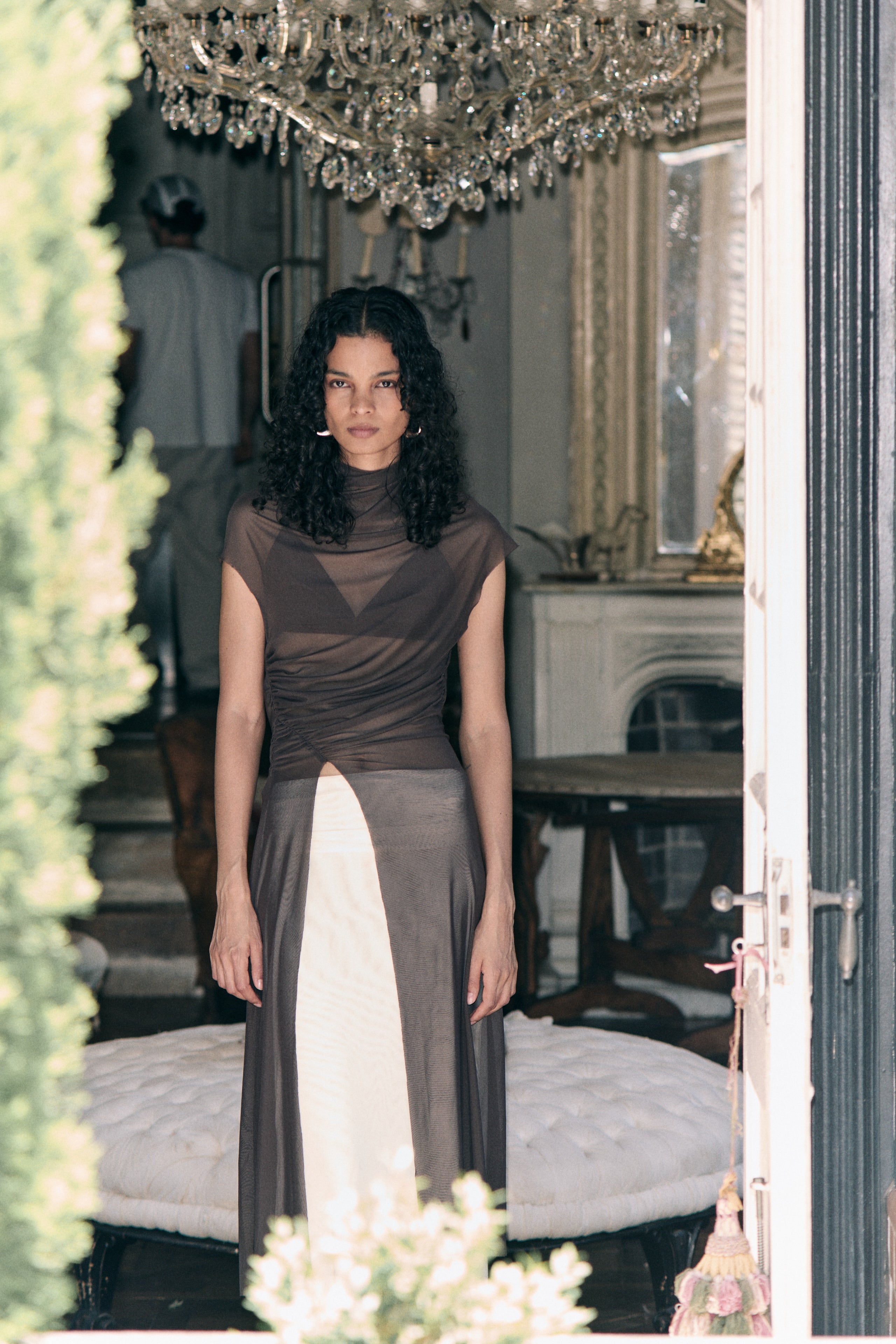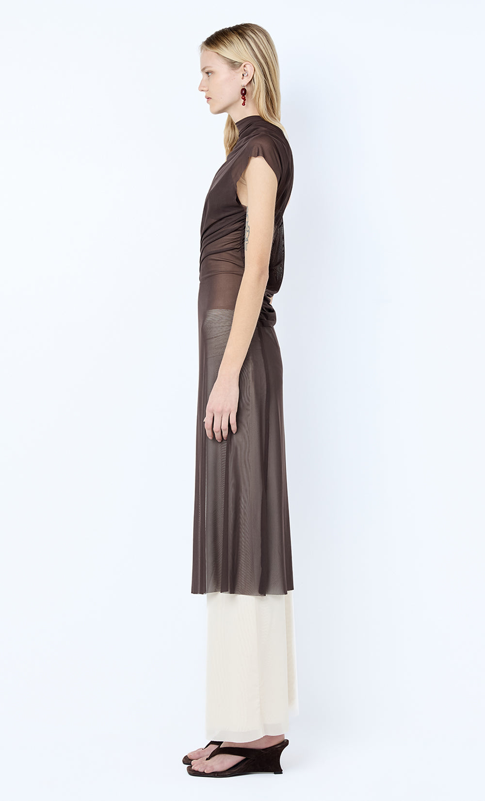 Eva Split Tunic Top in Dark Choc. A statement mesh tunic perfect for evening events, cocktail parties or layered styling.