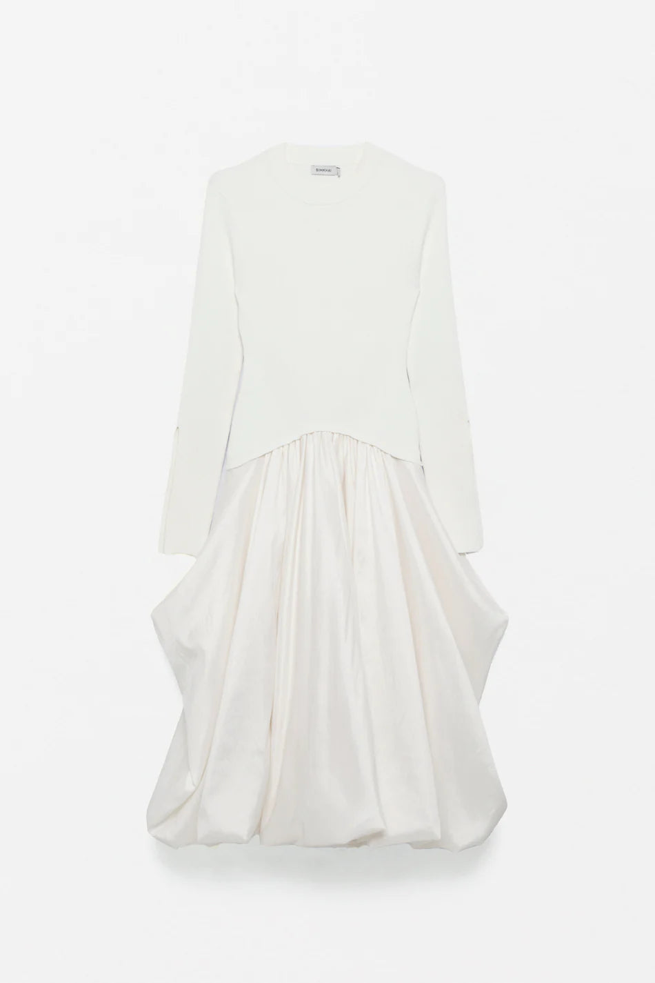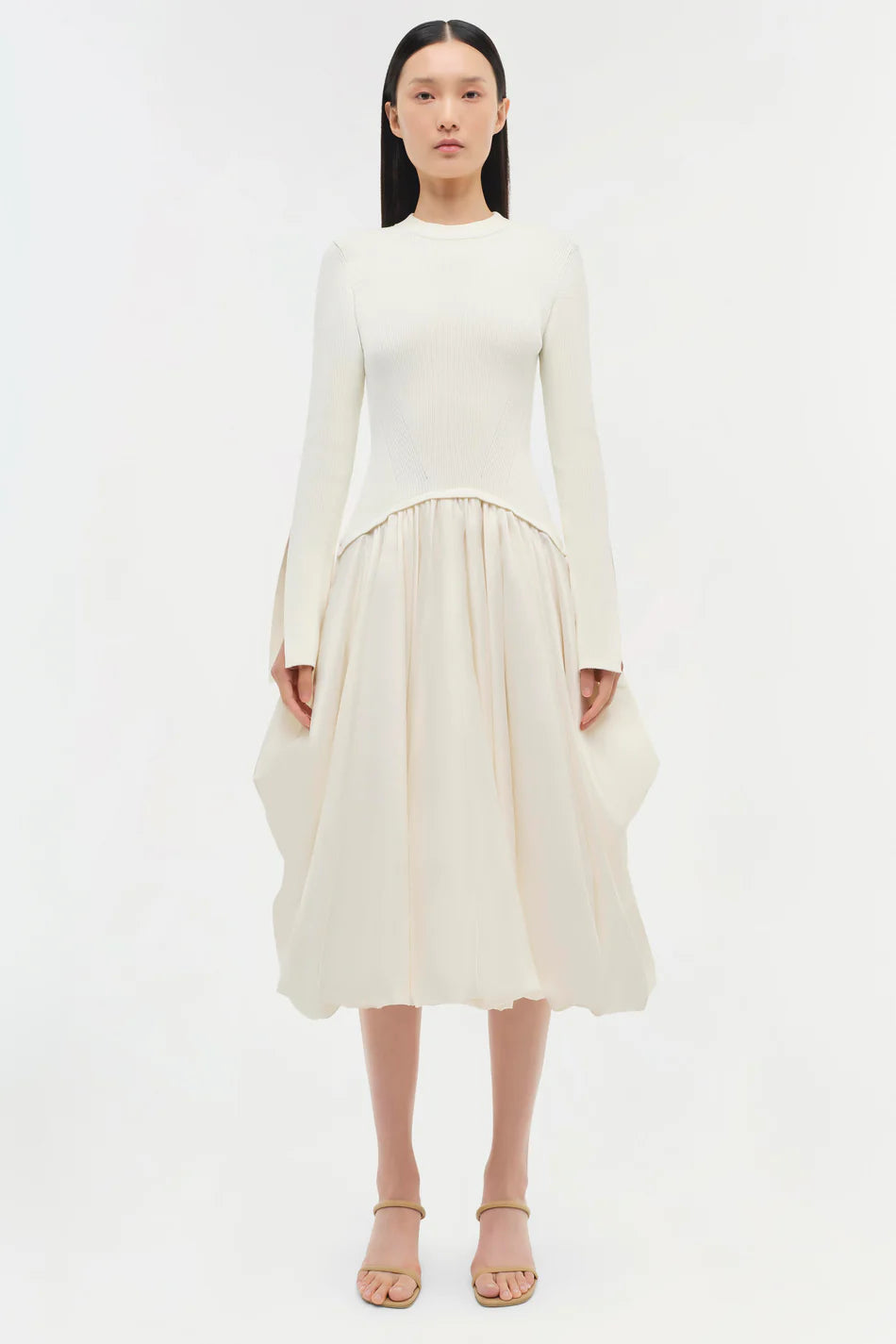 The Kenlie Dress in Ivory. Meticulously crafted mock neck midi featuring form-fitting long sleeves with artful side cuts. Sculpted bodice transitions to a voluminous skirt, blending poise with a hint of playful drama.