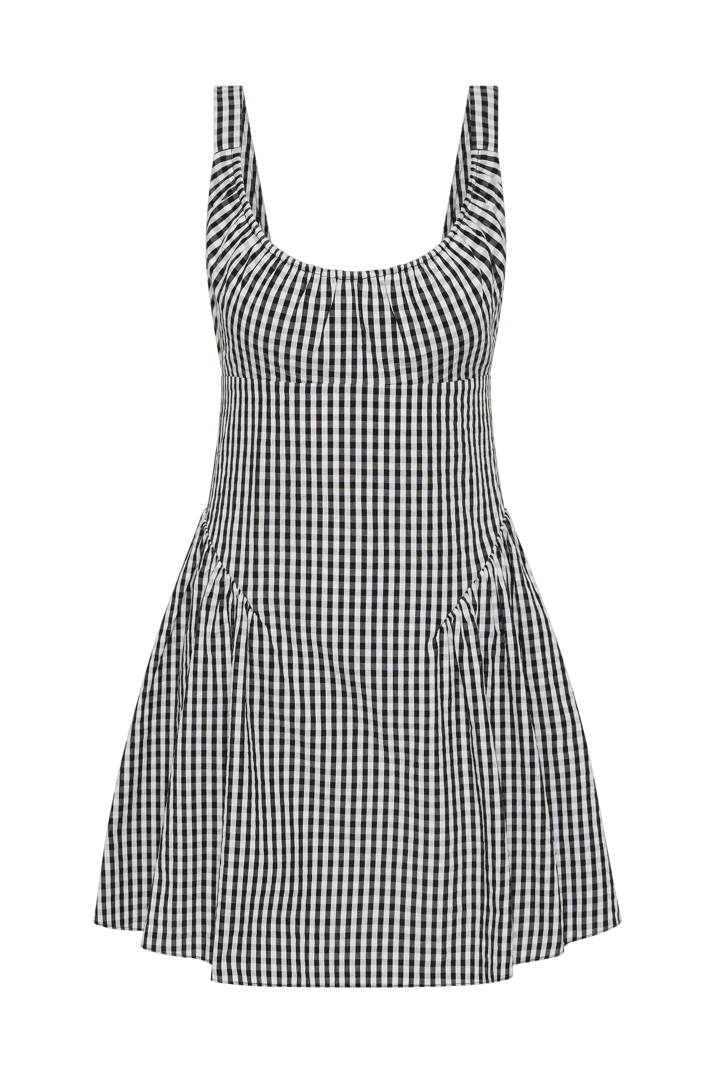 A vintage-inspired mini dress, designed from a signature 100% cotton, yarn-dyed in a nostalgic black and white gingham. Fitted through the bodice with a scoop neckline and gathered bust, it features a drop waist silhouette with further gathering at the sides. From there it falls into a soft A-line skirt, cropping short on the body. With effortless throw-on throw-off appeal, style with a simple sandal for long summer days.