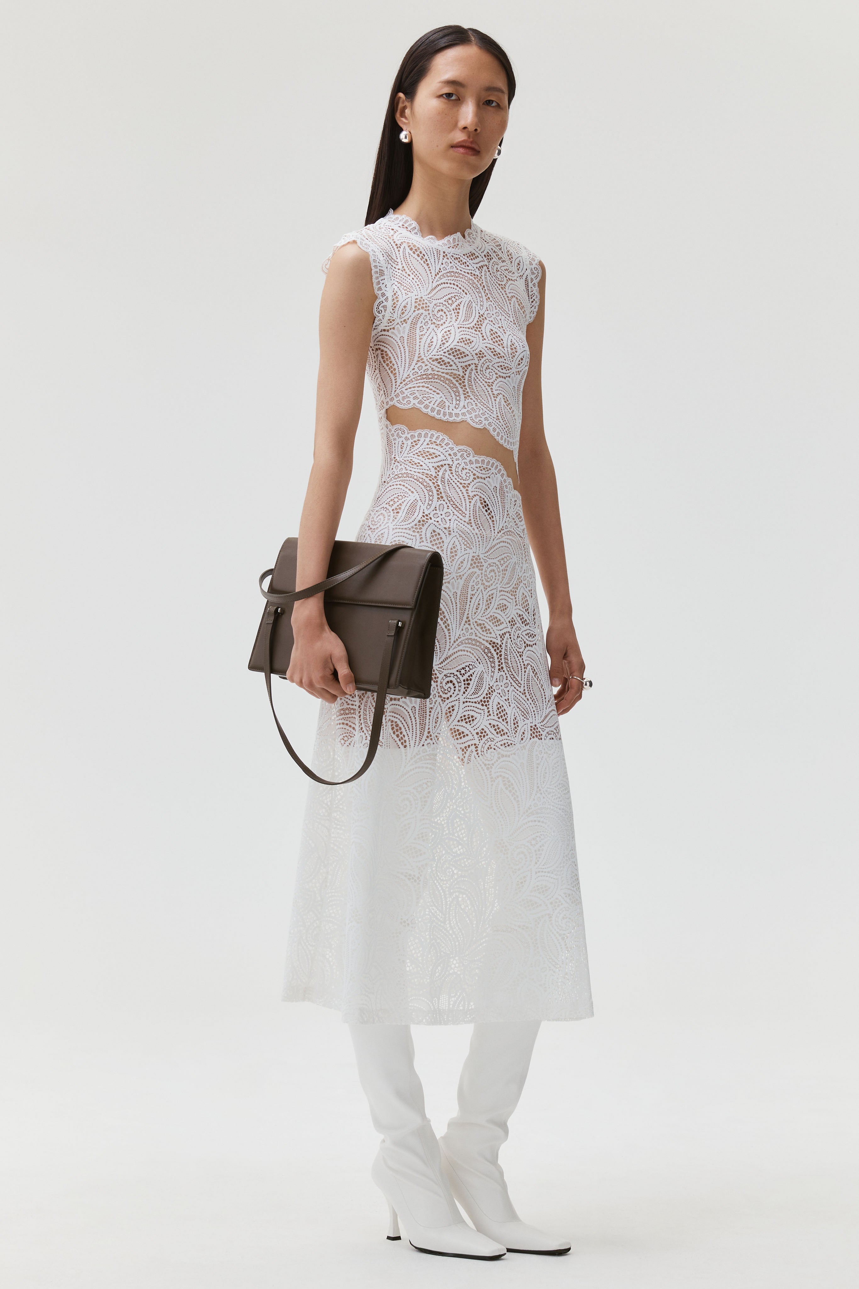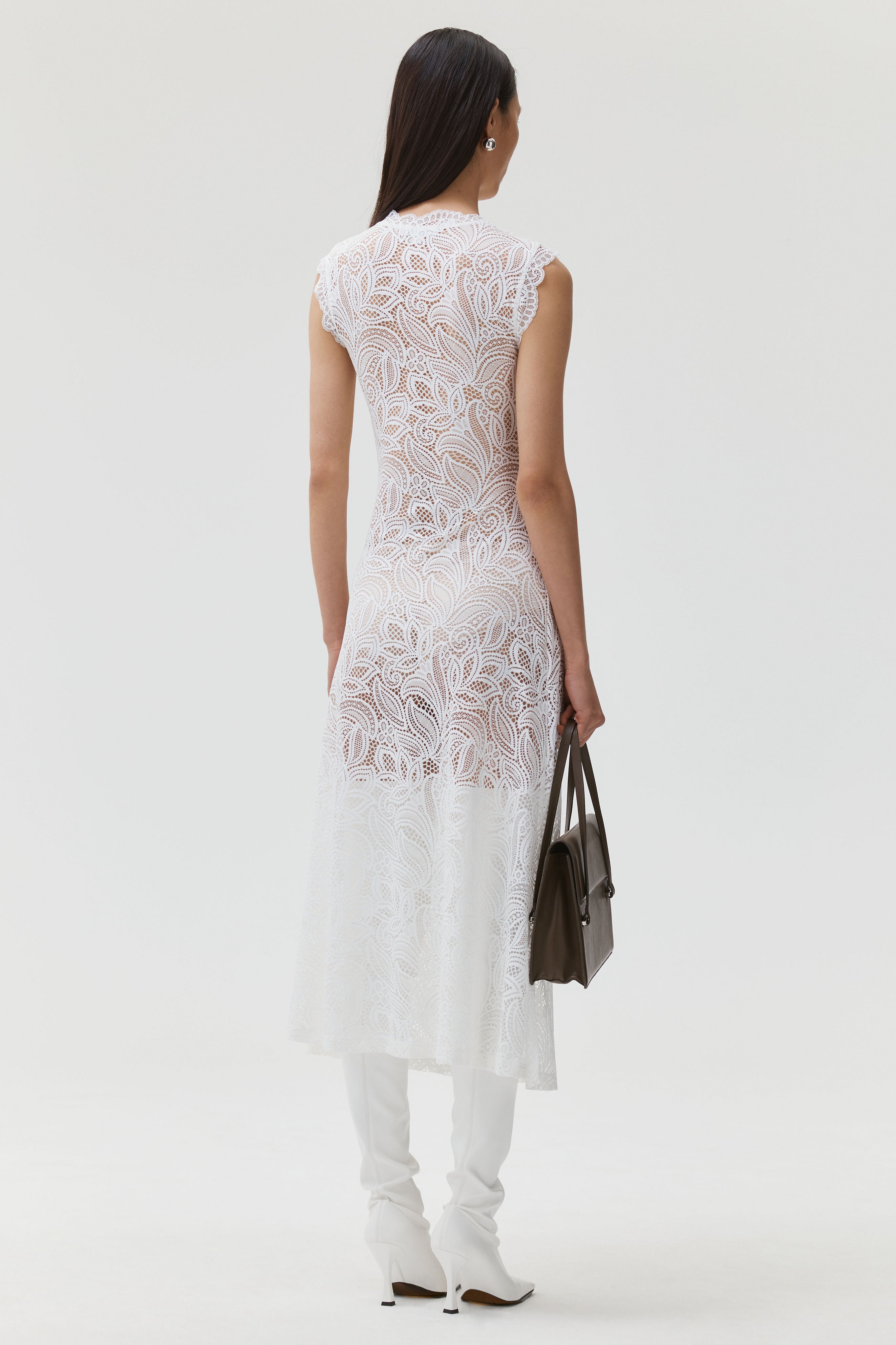 Sleeveless crew neck midi dress with a stylized front slit at the waist. This dress features a decorative scalloped edge at the neckline, armholes, and front slit.