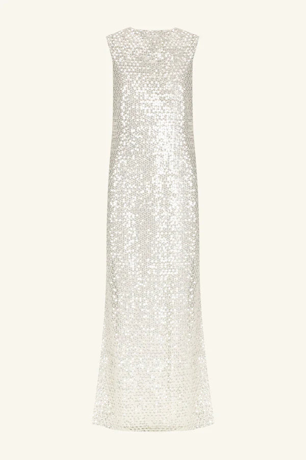 High neck sleeveless maxi dress with side split in an embellished mesh.