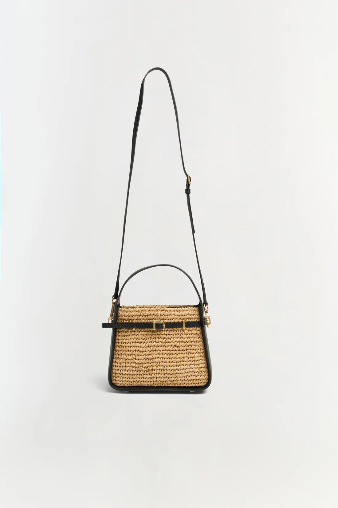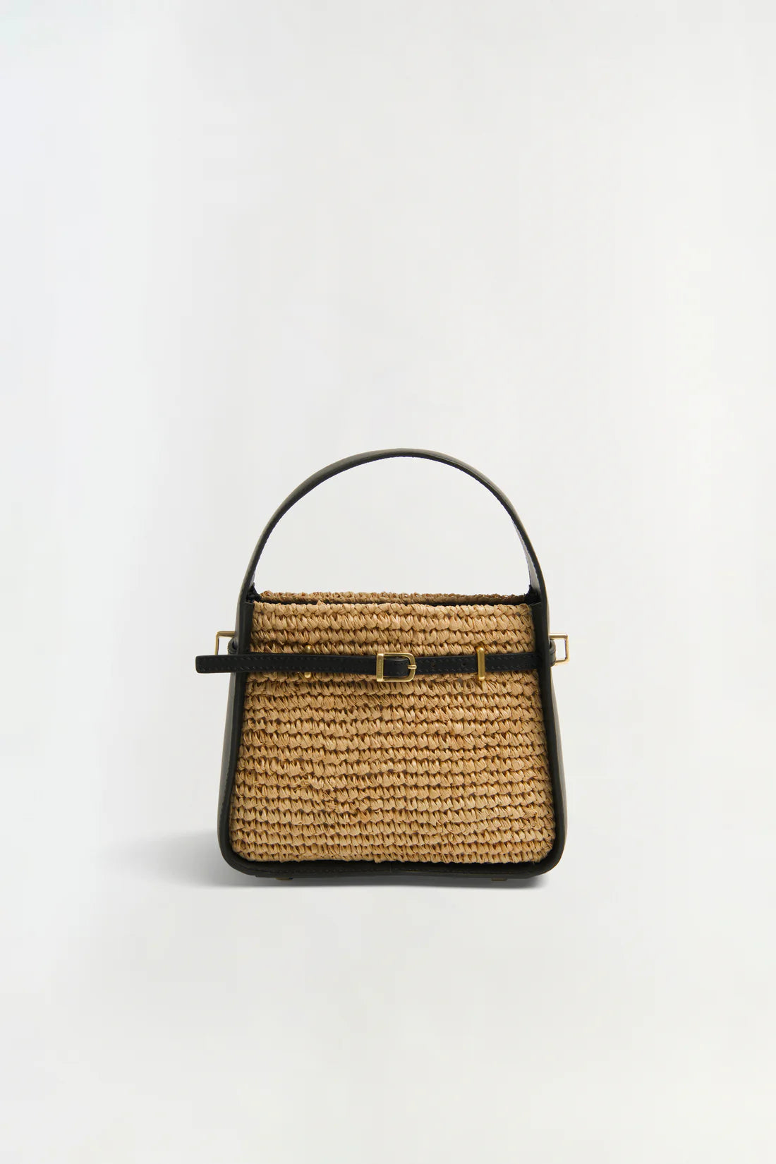 The Cleo Mini Raffia Bucket Bag in Black Natural. Crafted in a bold silhouette, this sculptural mini tote pairs smooth leather with woven raffia for subtle contrast.